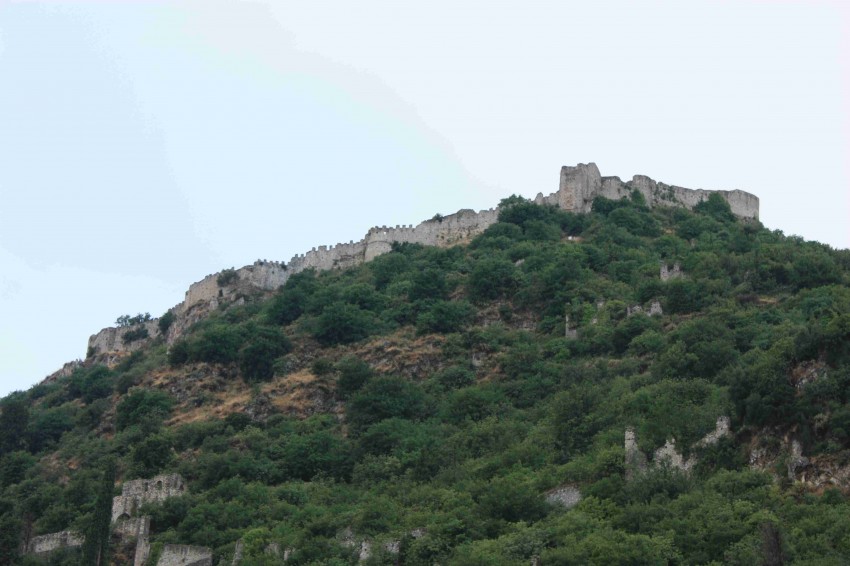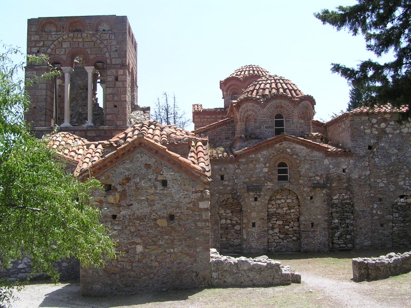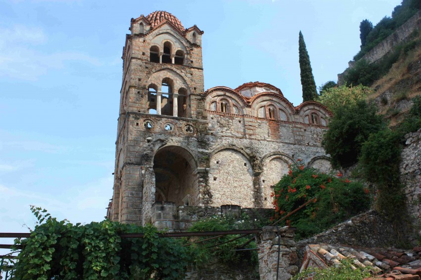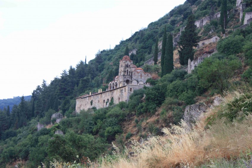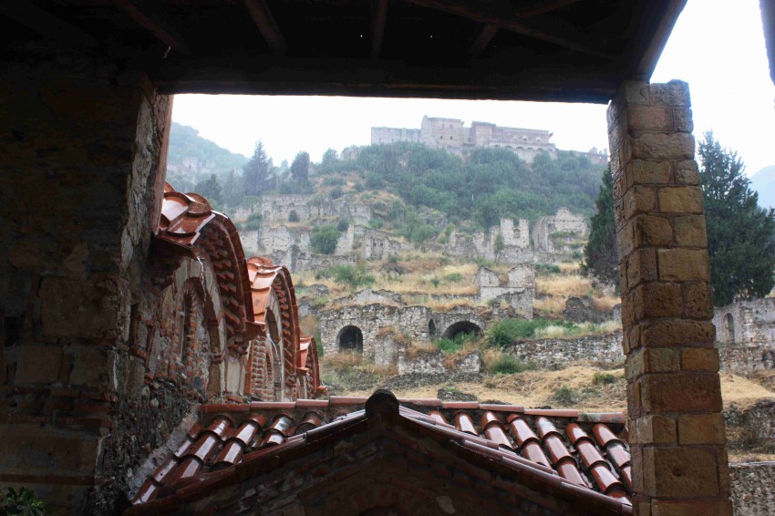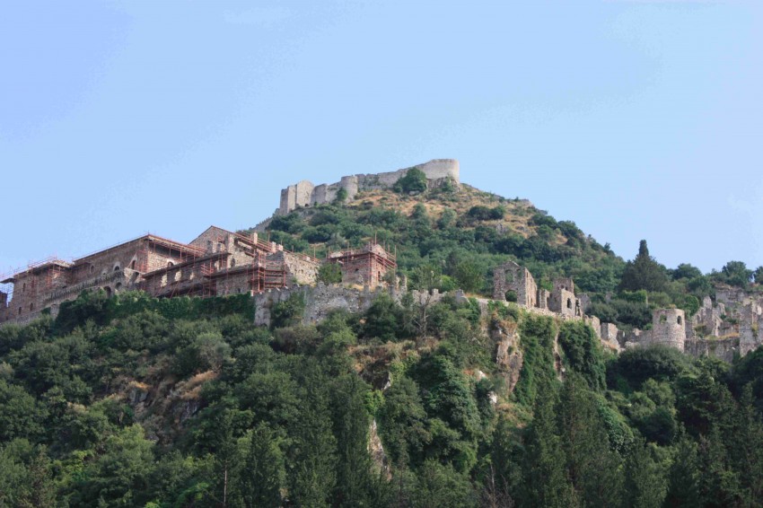 K hradu prídete priamo od hornej brány. Zachoval si pôvodný vzhľad, výstup je dosť strmý, ale odmenou je krásny výhľad na celú Mystru. Najzachovalejšími stavbami horného mesta sú kostol Agia Sofia /1350/ s nádhernou mramorovou podlahou a s freskami znázorňujúcimi Krista a Madonu. Cestou dole prejdete okolo najstaršej stavby Byzantského paláca Palataki /1250-1300/ a kostola Agios Nikolaos zo 17.storočia. Cesta vás ďalej zavedie k opevnenej Nafplijskej bráne a ku palácu Despotov /1249-1400/ v súčasnosti v rekonštrukcii. Na prelome horného a dolného mesta stojí Monenvasijská brána, tu je dobre sa rozhodnúť či budete pokračovať cestou dole alebo sa vrátite k hornej bráne a presuniete sa k dolnej. Keď ste autom, druhá varianta je lepšia.